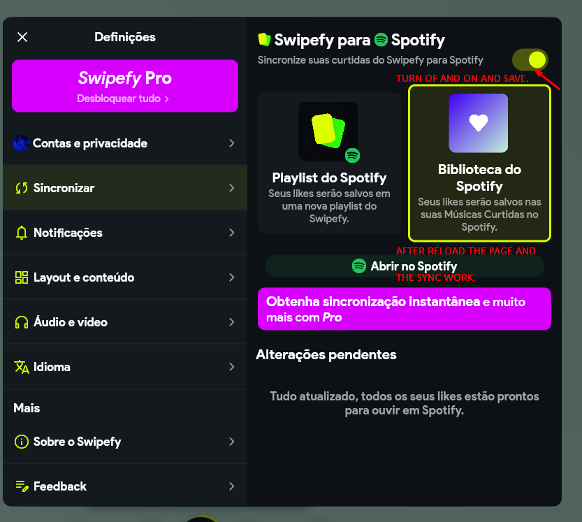 If your songs are not synchronizing with your Spotify like library, you will need to disable your Swipefy synchronizing in the settings and activate again and then recharge swipefy in the work browser. My songs have not been synchronized for more than 2 days. Note that I use the free version, I think only in the browser this bug is happening: https://web.swipefy.app/